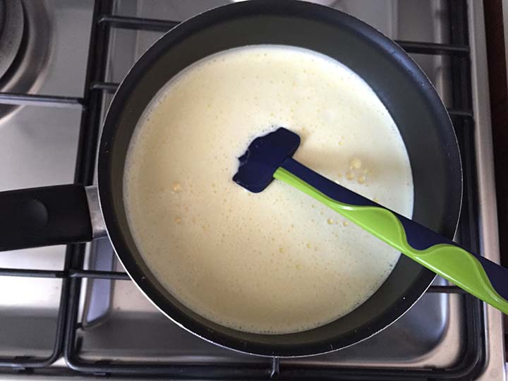 A questo punto unire il latte, al composto di uova e zucchero; il latte dovrà essere aggiunto poco per volta utilizzando questa volta una classica frusta a mano, disporre il tutto in un pentolino.