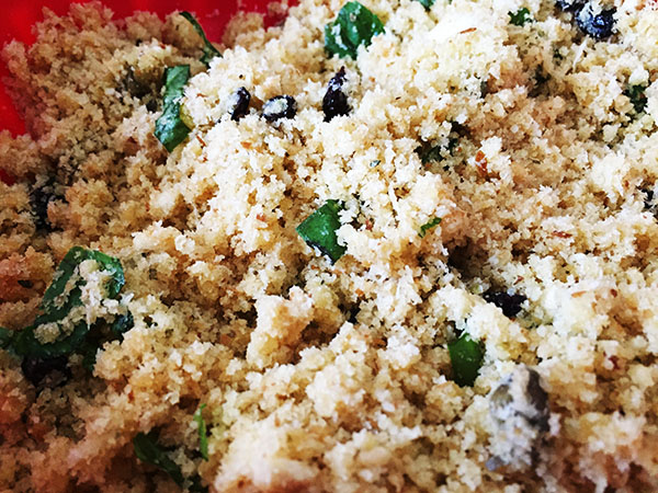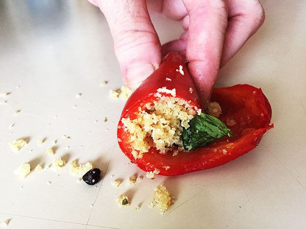 Dividete il peperone sbollentato a metà, prendete un po’ del condimento e formate un involtino arrotolando il peperone attorno al condimento.