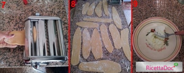Ora cominciate a tagliare con un coltello, un pezzo di pasta (fig.6) passatelo nella farina e stendetelo con l’aiuto della macchina per pasta (fig.7). La sfoglia dorrà risultare alquanto fina. Una volta che avrete stesso per benino tutta la pasta(fig.8), fate il ripieno del raviolo. In un piatto prendete lo stracchino e la ricotta e amalgamateli con una forchetta fino ad ottenere un unico composto(fig.9).